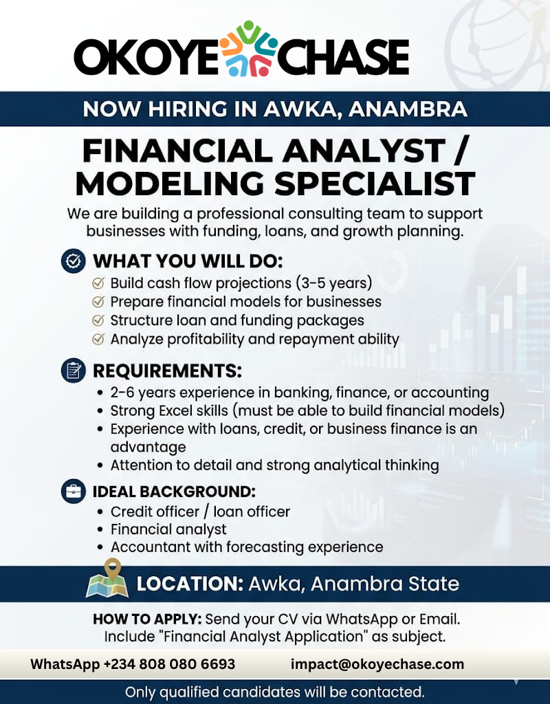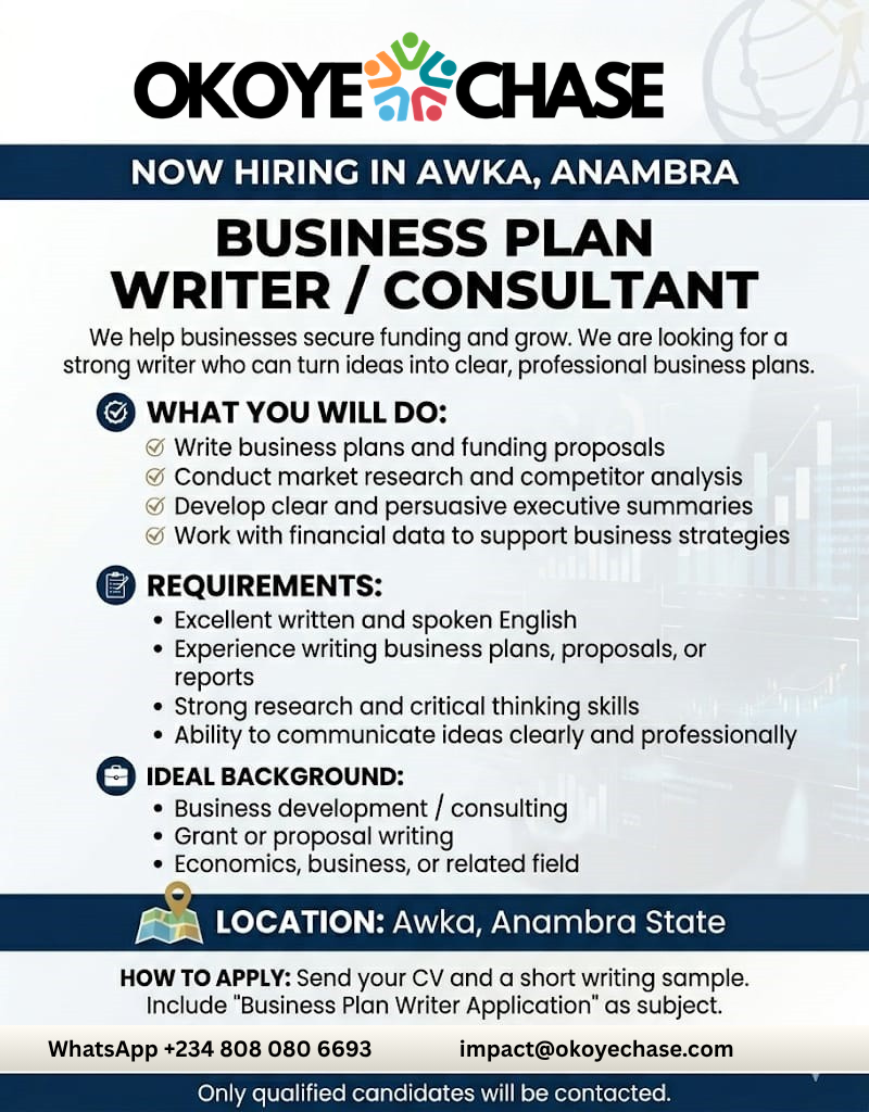 Please see the job description and send your CV or resume to impact@okoyechase.com.